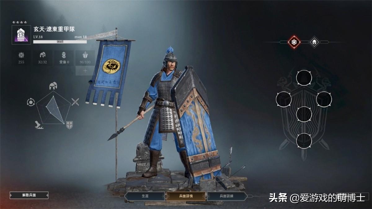 由于游戏中存在着非常多的远程攻击手段,比如弓箭、火枪等等,如果没有大盾兵的保护,己方的攻击部队很容易大量减员。重甲部队的作用就是一边掩护己方部队一边向前推进,如果用得好,我们可以用极少量的损失去击溃敌人的阵型。大盾兵自然也有弱点:向前架盾时士兵后方是不会有任何防御的,所以很容易被敌人从侧边或后方冲进阵型中使用技能而造成阵型崩溃。