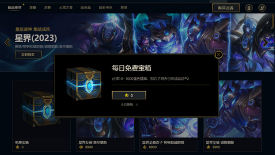首先,别忘了每日宝箱。每天都有机会免费领取蓝色精粹,虽然数量不多,但积少成多,每天的运气也不同。这是一个简单而持久的方法,不要错过它。