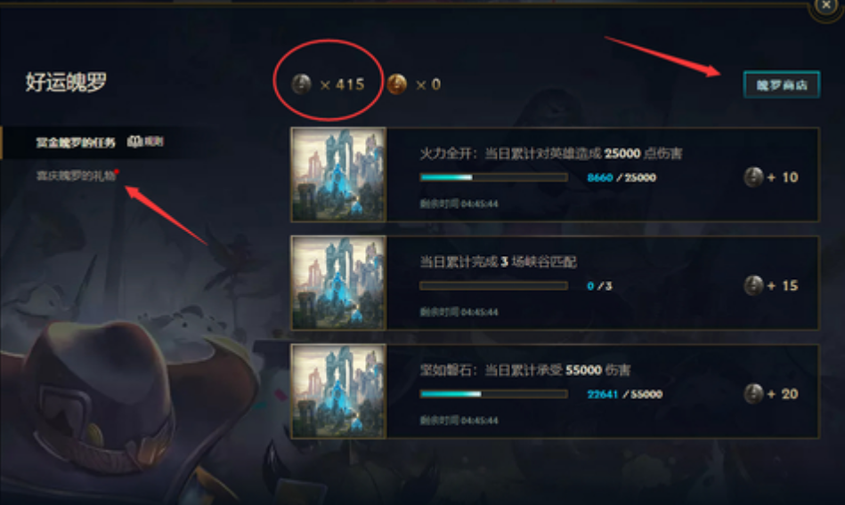在主页右边的礼物盒图标下,你会找到“好运魄罗”。这个活动可以让你通过收集魄罗币来兑换蓝色精粹。在魄罗商店里,你可以用100魄罗币兑换100蓝色精粹。魄罗币是在喜庆魄罗的礼物那里领取的,每天登录1-15天,根据登录天数领取魄罗币,然后再用它们来兑换蓝色精粹。