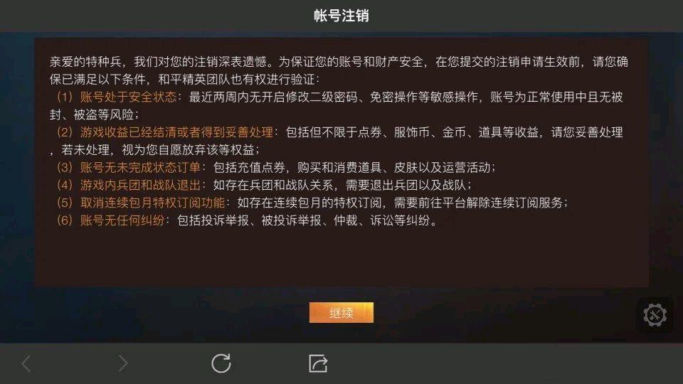 满足这5个条件,就可以点击“继续”并注销账号了,注销之后,这个账号所有的信息、游戏数据、游戏内的资产都会被清空,且不可恢复!