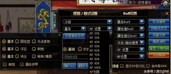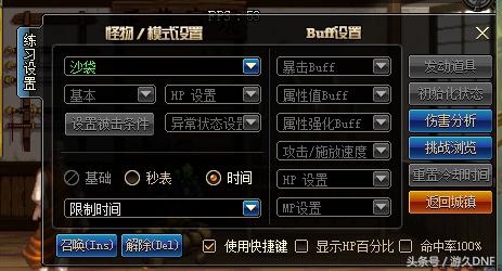 这个模式下,只有沙袋,BUFF和被击条件一律无法设置,可选的选项有秒表和时间。不过要注意的是,点击召唤以后,身上BUFF会重置,只有5S的时间上BUFF,手速要快。