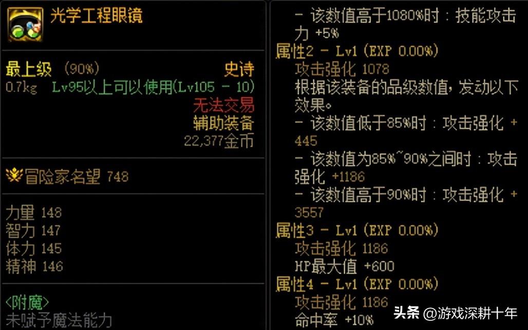 平均装备品级达90%,12件装备总数值是1080%,光学工程眼镜的品级必须要达到90%以上的