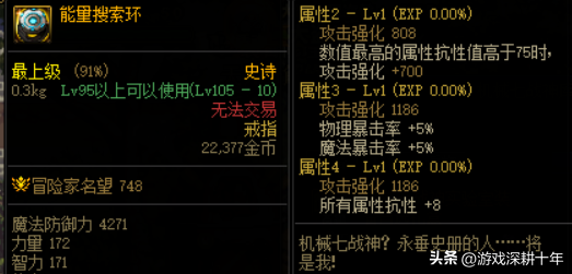 第二个装备是 能量搜索环,属性一要求最高属强达到300点,属性二要求最高属性抗性达到75点,彩色徽章、军团天界戒指 、时装腰带、新春红色宠物装备可以加抗性