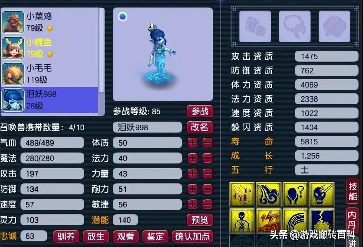 上图这只泪妖就是玩家为捉鬼专门配备的,这是一只攻击资质1475,成长1.256的出其不意+壁垒永动机,捉鬼的实用性非常高,和善恶相比,不会出现加血的情况;和力劈华山相比,壁垒攻击速度明显快很多。