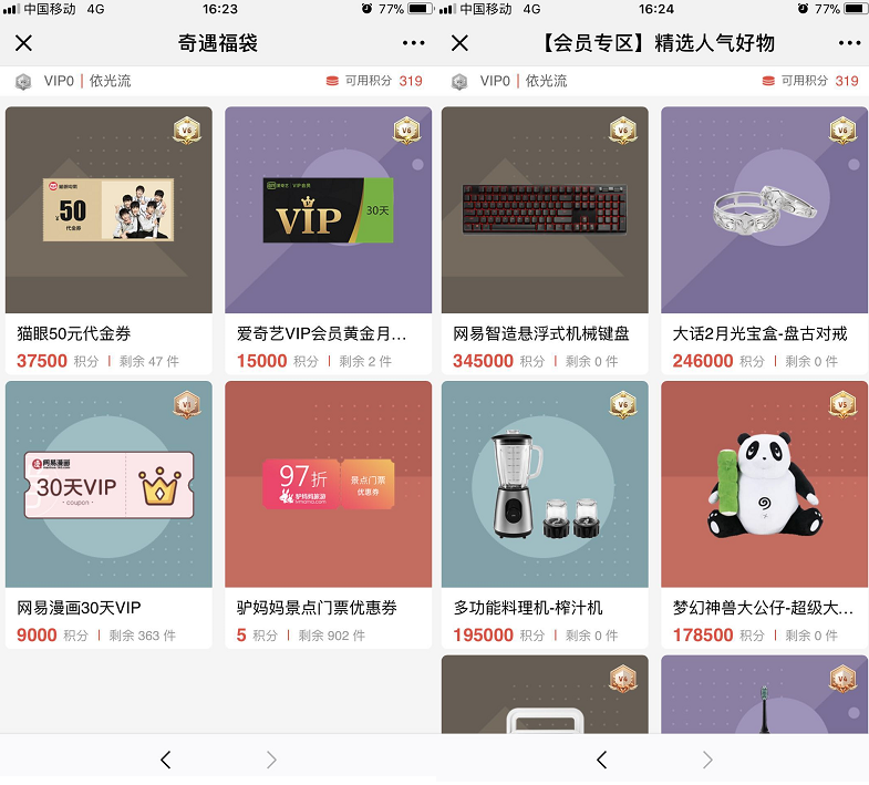 福袋、兑换两个功能则分别对应不同价值的礼品,消耗的积分也不同。前者更侧重小额的线上优惠功能,后者则经常引入一些大型的线下实体礼品。