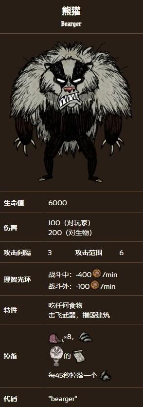 熊獾具有较高的疯狂光环,建议玩家准备一定量回复理智值的食物或佩戴蜂王冠,否则可能同时面对熊獾和暗影生物。