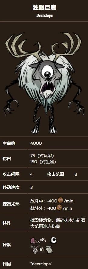独眼巨鹿血量在boss单位中相对较低,攻速较慢,准备足够的防具、食物和武器,硬扛伤害击杀巨鹿不是难事。独眼巨鹿的攻击具有冰冻效果,玩家被连续击中