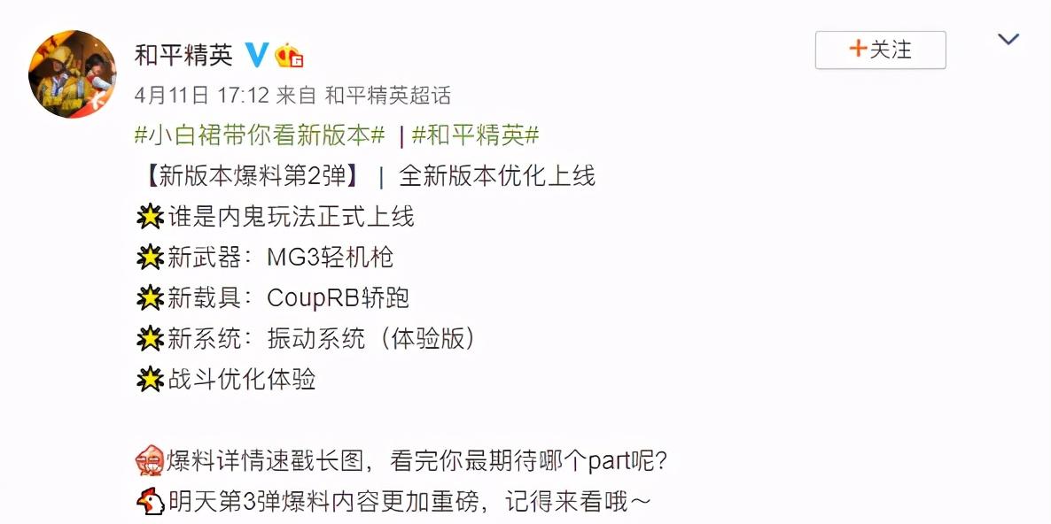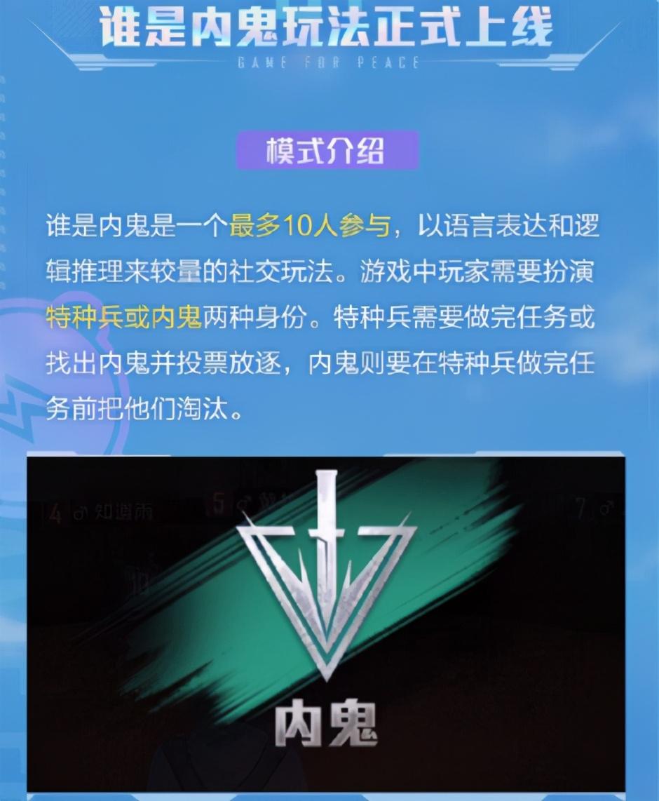 前段时间,和平精英体验服增加了很多新玩法,让不少体验服玩家直呼过瘾!如今和平精英官微正式宣布了正式版的更新内容,加入了「谁是内鬼」、「MG3轻机枪」、「CoupRB轿跑」以及「振动系统」等一系列新鲜出炉的内容。可以看得出来这次可以称得上是近期改动最大的版本之一了,那么我们就一起来看看这些新版本有何玩法吧。