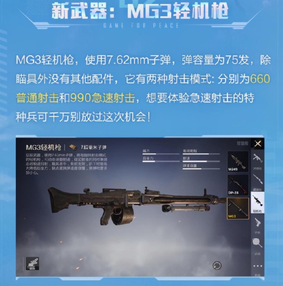 除了「谁是内鬼」新模式之外,和平精英还将加入新武器、新载具等。而这次的「MG3轻机枪」将会有两种射击模式:660普通射击和990急速射击,势必对玩家们的手速、压枪技巧有着极大的考验。另外,「CoupRB轿跑」顾名思义当然会显著提高行驶速度,对玩家们的开车转向、反应速度也有着更高的要求。