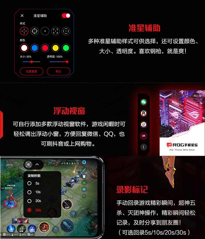 当然了,在游戏小功能方面,ROG也交出了一份较为满意的答卷。玩家们在使用ROG游戏手机5畅玩和平精英手游时,能够开启「准星辅助」、「浮动视窗」、「录影标记」等功能。当开启「准星辅助」时,玩家们能够显著提高“盲狙”、“瞬时开枪”的成功率,实现先人一步击倒对手。「浮动视窗」则是方便了我们在游戏过程中快速回复信息等操作,实现游戏、聊天两不误的交互体验。而「录影标记」能够在游戏后,一键记录游戏中的精彩操作,更方便地分享自己的「超神操作」。
