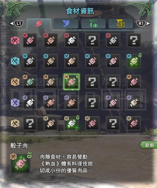 世界》中共有四大类食材:肉、鱼、菜、酒;每个大类下面又分为五种(酒类只有两种),各自对应不同颜色的图标,未解锁的食材以问号显示;部分食材会带有一个绿色的图标在右上角,这表示该食材处于“新鲜”状态。新鲜食材每次回到据点都会随机刷新。如下图: