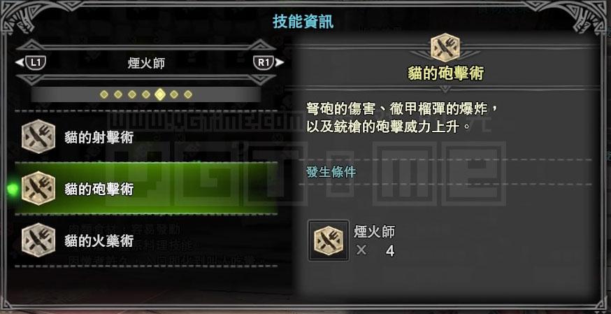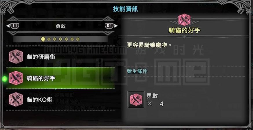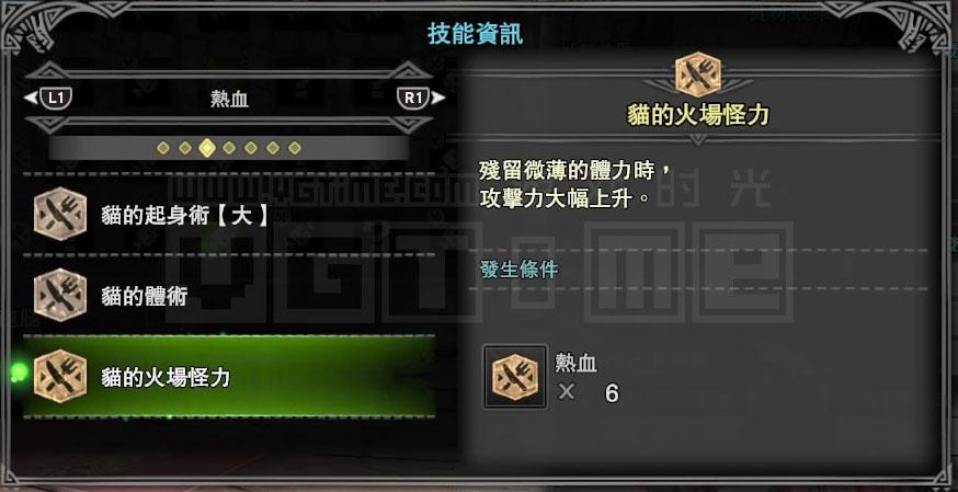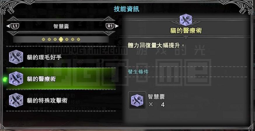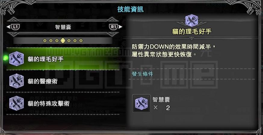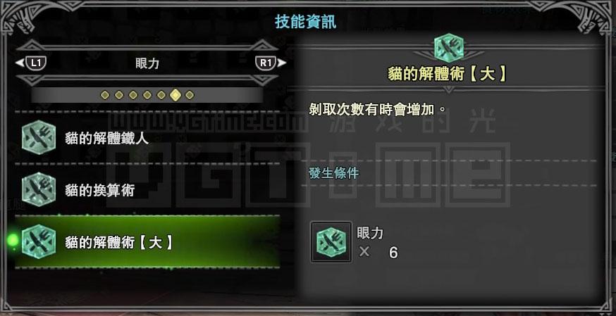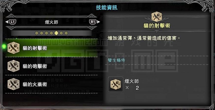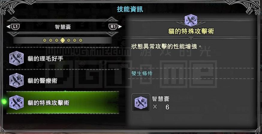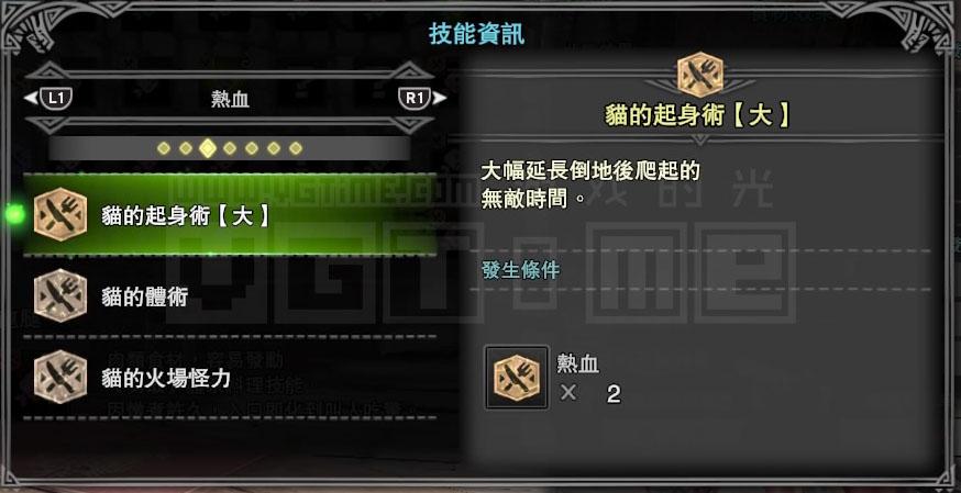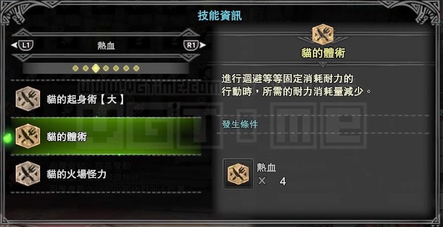 接下来就要考虑技能,我是一个用弓箭猎人,那么肯定会经常用到滑步回避蓄力,而【猫的体术】能够降低回避动作的耐力消耗,【猫的射击术】则能强化通常箭的伤害,这两个技能对我比较有用。
