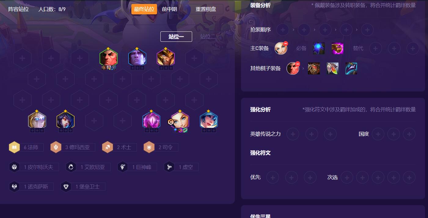 前期,可以上两法师、两司令,就是斯维因、提莫、奥莉安娜,没有刷到斯维因之前,可以用堡垒卫士,或者是两格斗家。另外,法师中的塔里克也有堡垒卫士羁绊,虚空中有两个法师,一个堡垒卫士。因此,后期到了五六人口的时候,可以再搭配3虚空。