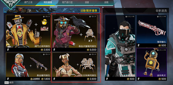 接下来,如上图所示进入“特别优惠”商城,注意红框部分的两个同捆包:“寻血犬奋战同捆包”是一个金色品质皮肤加上7个活动宝箱,总共5000金币,由于该皮肤也属于12个金色道具中的一个,所以相当于是5000金币可解锁8个活动宝箱,比单纯买8个活动宝箱所花的5600金币要便宜600金币;