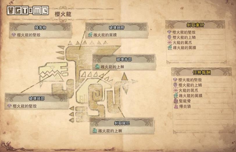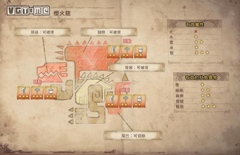 樱火龙是雌火龙的亚种,很多招式是相通,不过樱火龙的活动更加频繁,招式更具威胁性。它的最大弱点是龙属性,主要异常属性弱昏厥,非常容易砸晕,推荐带上打击系和龙属性的武器。