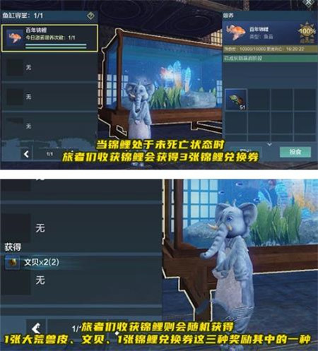 然后玩家可以放在鱼缸里面,进行养鱼,如果你把这个锦鲤给养活了,就可以得到三个锦鲤兑换券,如果不小心没有活下来,那么只能得到一个锦鲤兑换券。