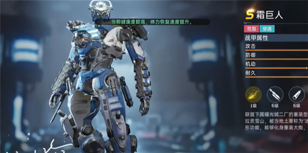 霜巨人是pvp和PVE模式中表现都是s等级机甲中最实用极强的 ,拥有最高的伤害和持续性输出的功能,但是机动性是一定硬伤,可以用来打怪躲避对手。