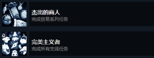 前者需要完成手手相传任务即可达成,后者需要完成所有任务,全支线任务我会做一期来讲解,一般正常完成全收集物品和全地图100%,去地图商人处完成绘制地图任务即可跳杯。