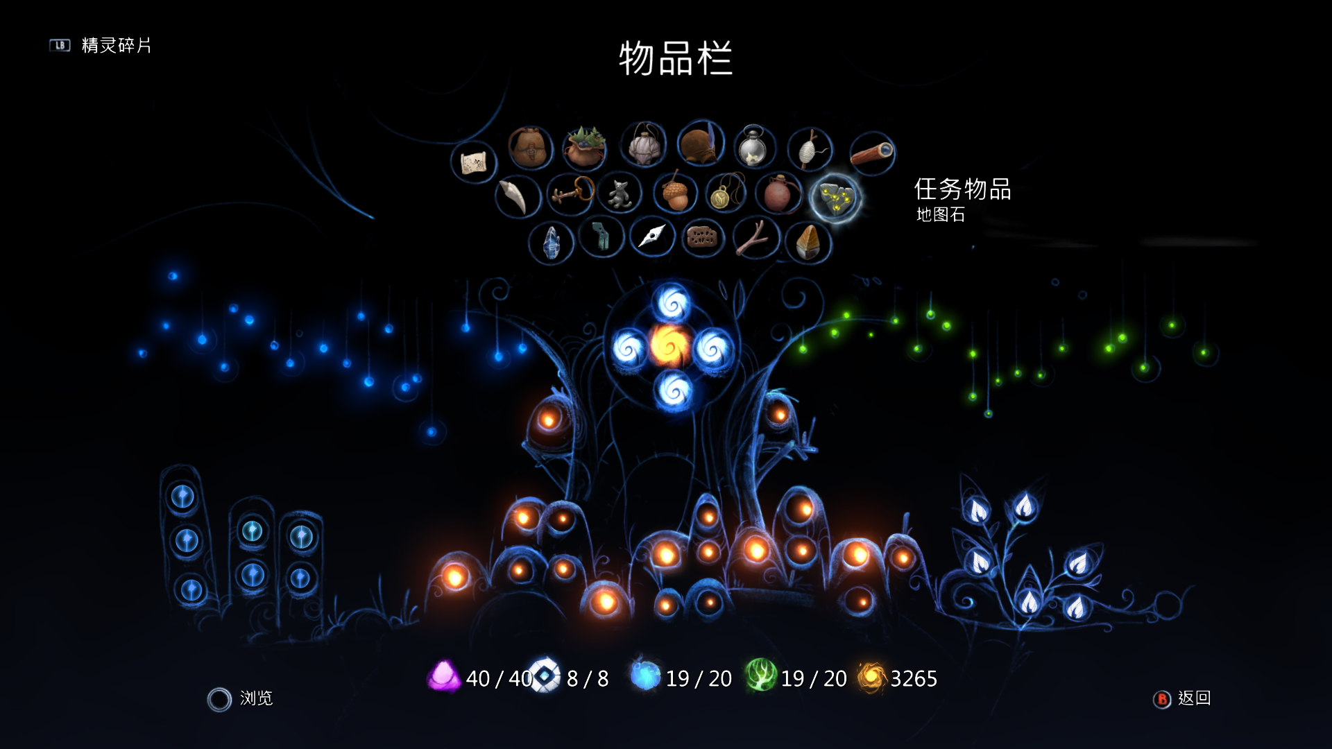 需要完成全支线任务奖杯、林地全建设奖杯、最大血蓝奖杯、6个种子、收集所有精灵光球、所有碎片等。详细如下图所示:可惜此档卡了结算BUG,血蓝没有达到最大20格。