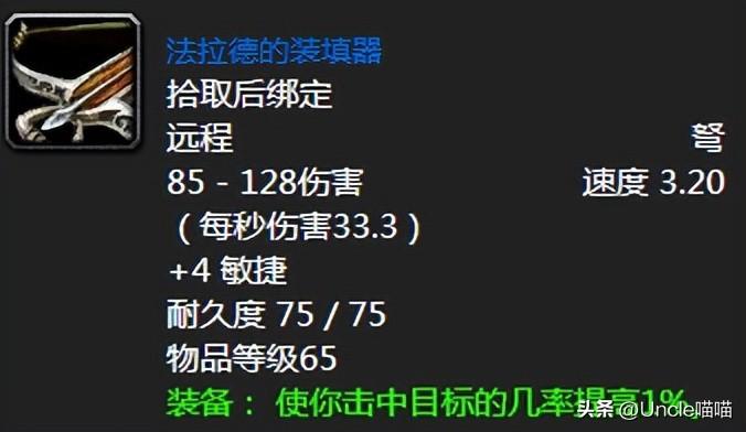 希利苏斯“完美的毒药”任务奖励的此款法拉德的装填器,个人觉得中期小号盗贼是非常性价比的东西,毕竟虽然说可以直接入萨特强弓,但是这丫的好歹比他多了一点敏捷,提升还是有一丢丢的,再者几乎等同于白给的他你还能要求啥?