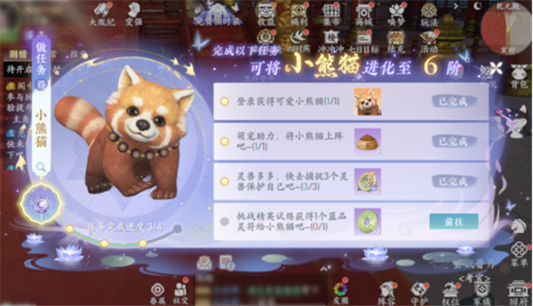 【活动内容】参与赠送可爱灵兽小熊猫!完成小熊猫挑战,获取橙品灵兽及大量灵兽养成材料!点击游戏屏幕左侧任务列表“小熊猫挑战”任务即可查看并参与活动~