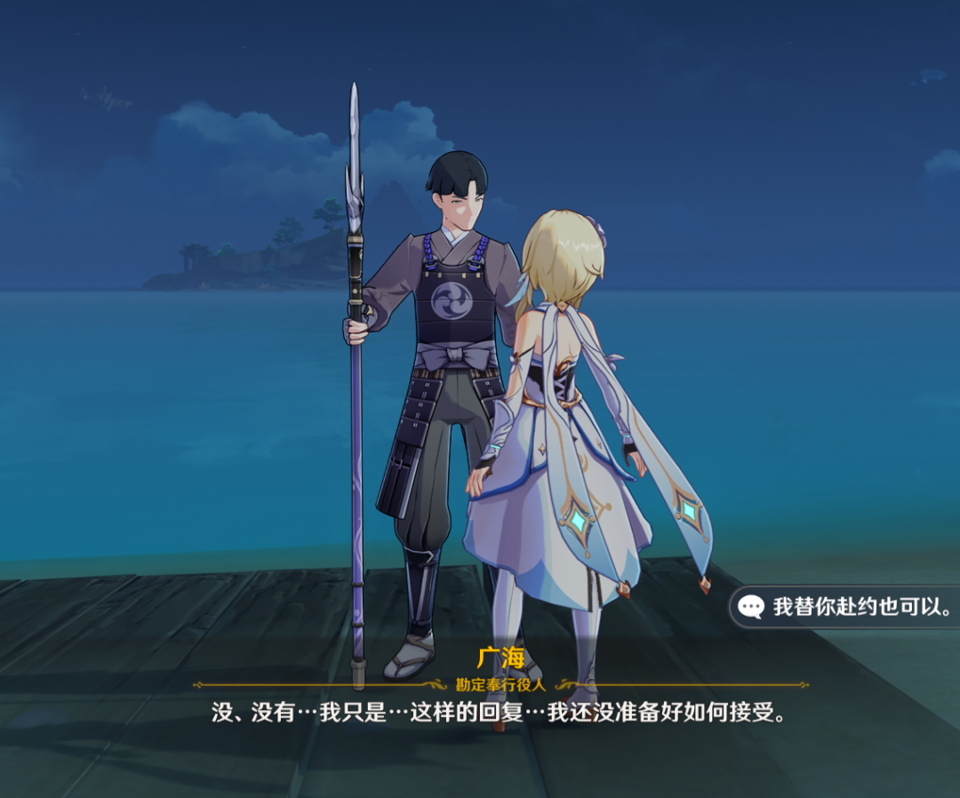 需要和他进行两次对话才能领取到任务——广海的守望,对话选项可以随便选,无影响。
