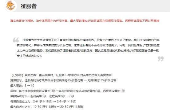 我们可以看到征服者移除掉了真伤并增强治疗效果,能理解为老版本的战争热诚加嗜血的效果,同时远程英雄的持续时间与近战英雄享受同等待遇的机制,这说明我们完全能利用这个持续时间对远程英雄进行配带,并且伤害理想还享有治疗效果的加成,相对于其他符文,收益都有着不错的提高。