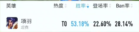 众所周知,专精装项羽凭借二技能强化普攻的回血能力以及必定暴击的设定,再加上残血使用大招那恐怖的爆发伤害,已成为当前版本的边路恶霸,使得项羽的出场率也随之大幅度上升,在巅峰赛的胜率更是飙升到了53%。