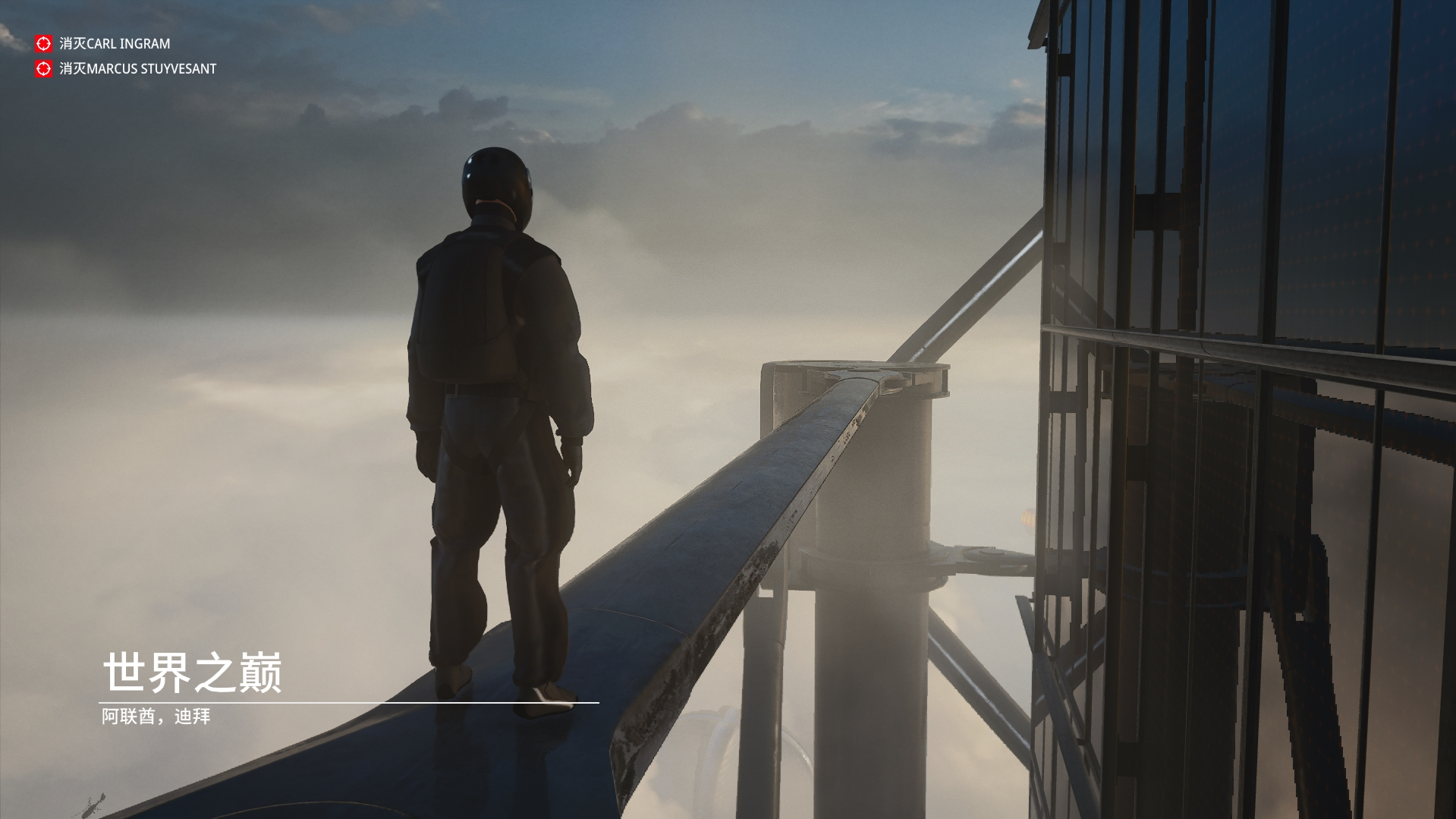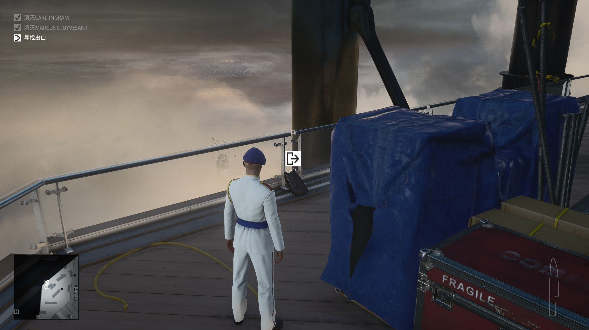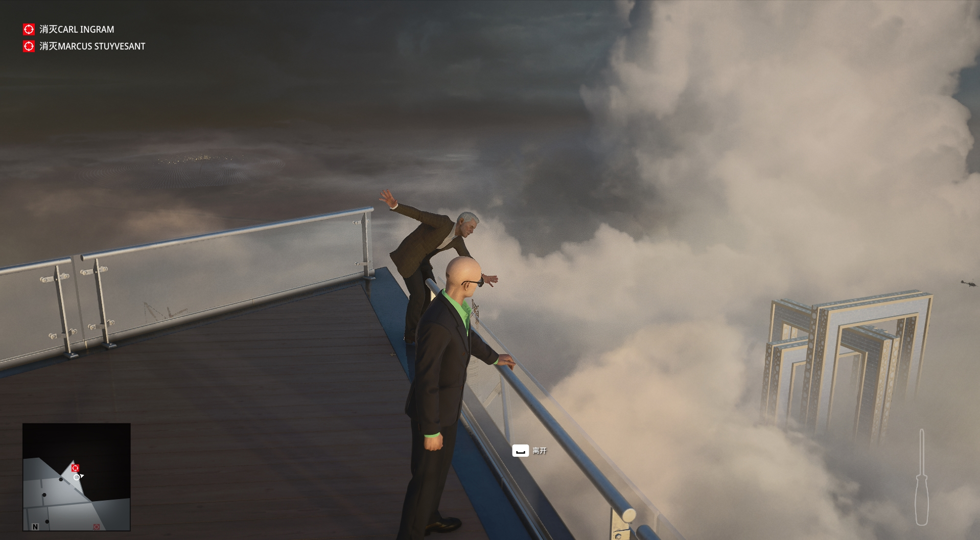任务故事完成后,来到他办公室外面的观景台,将护栏拆掉(之前捡硬币的地方旁边凳子有螺丝刀),在一旁等着目标来临,之后他靠住护栏就会掉下去,并完成对他的消灭。