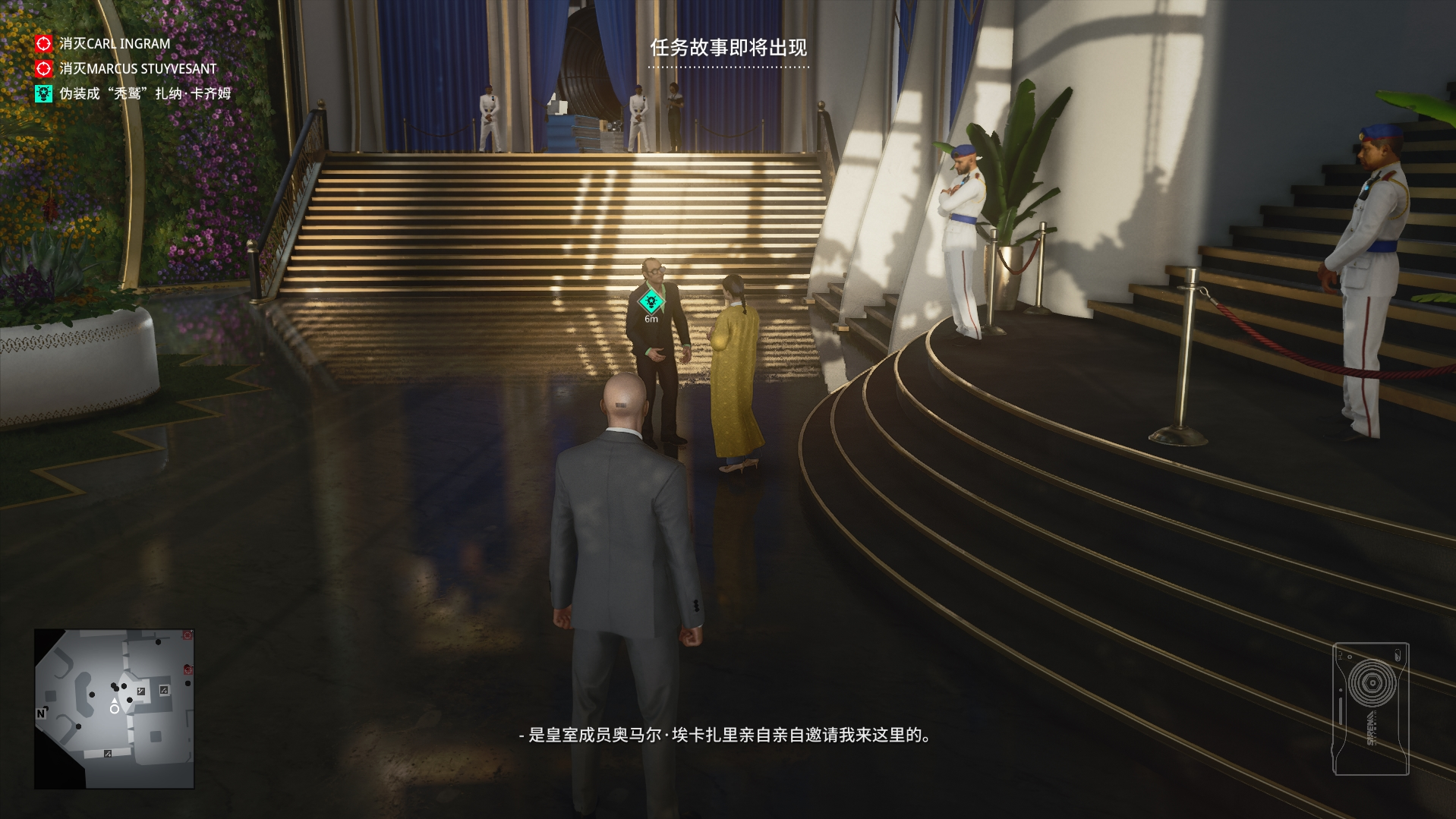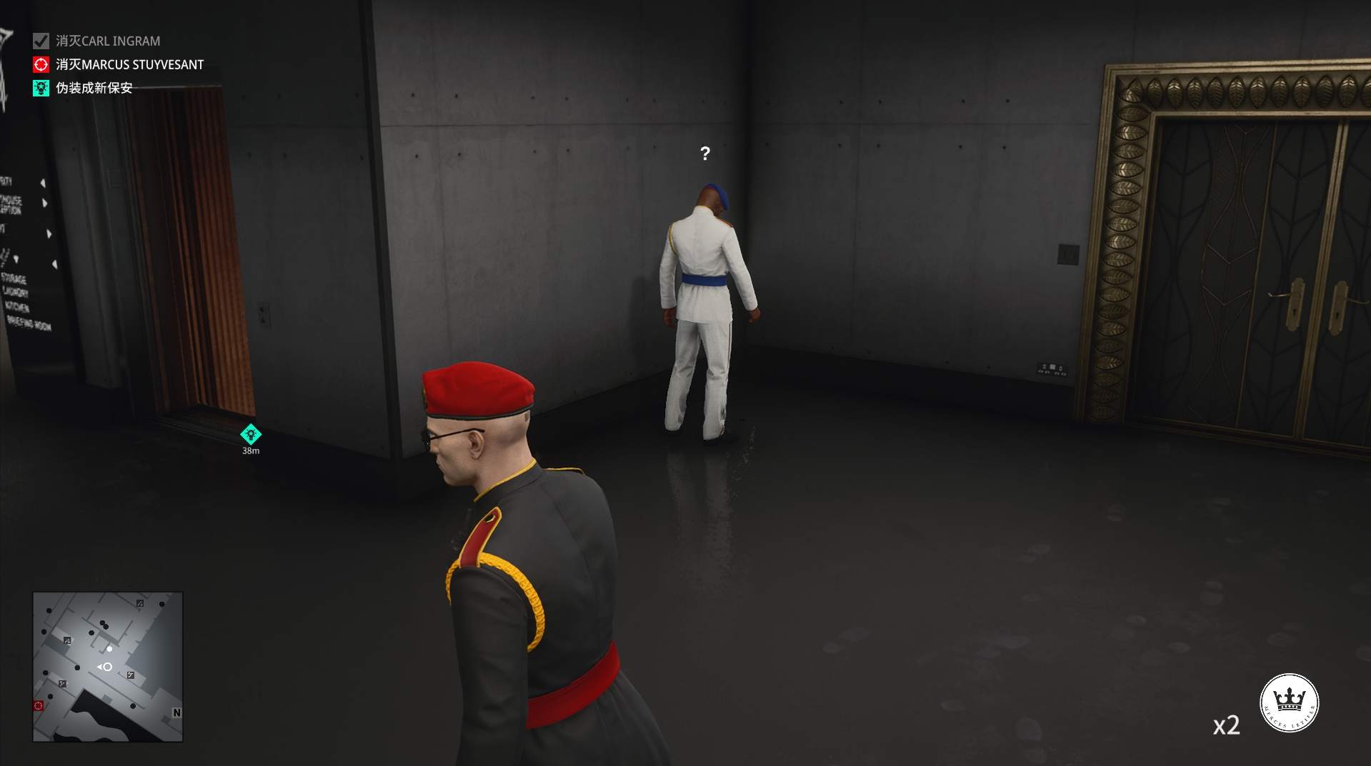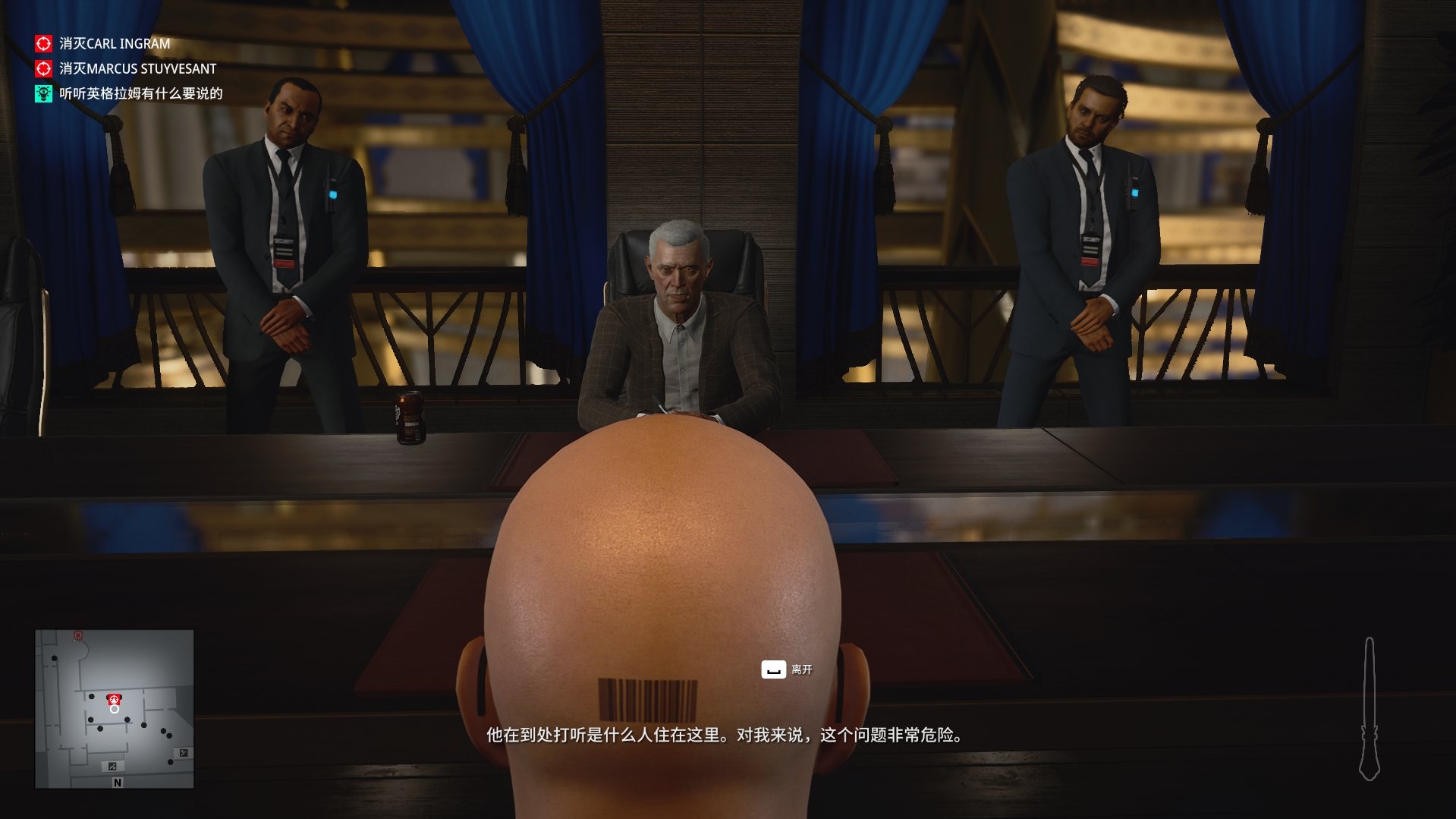 (2)进入内部我们一直往前走,来到秃鹫与助理交谈的地方,等他们两个交谈结束,来到这个位置,捡起凳子上的硬币,来到旁边围墙处,往地上扔一枚硬币吸引秃鹫过来,然后将他打晕,换上他的服装接收搜身并与助理见面。(不要捡上枪,不然搜身无法通过!)