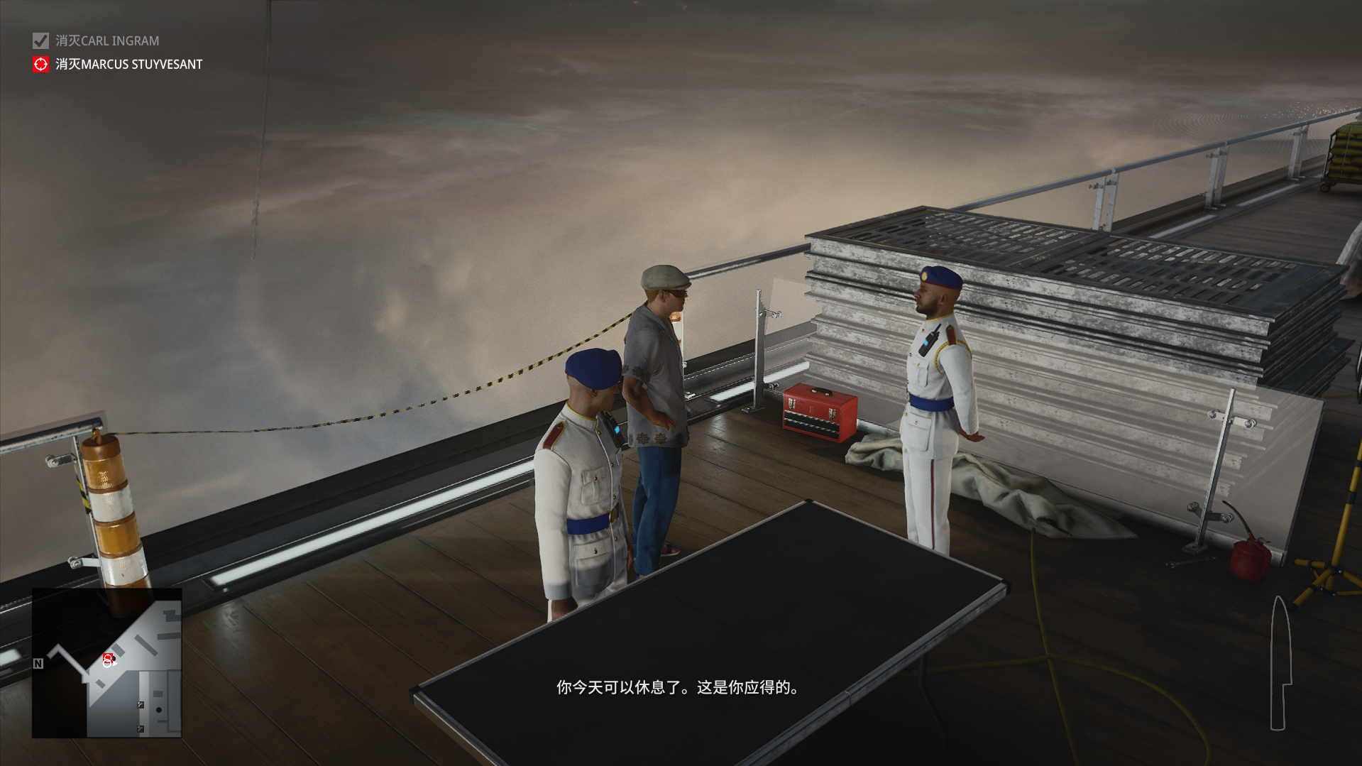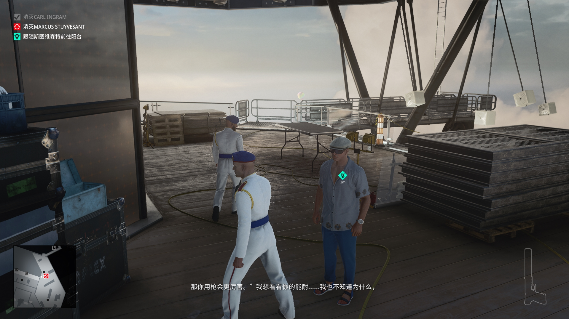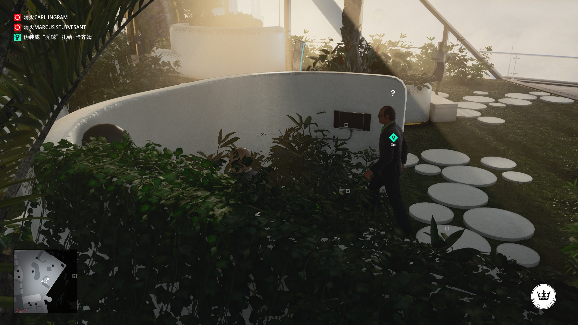 (2)进入内部我们一直往前走,来到秃鹫与助理交谈的地方,等他们两个交谈结束,来到这个位置,捡起凳子上的硬币,来到旁边围墙处,往地上扔一枚硬币吸引秃鹫过来,然后将他打晕,换上他的服装接收搜身并与助理见面。(不要捡上枪,不然搜身无法通过!)