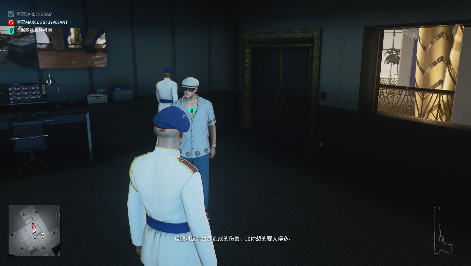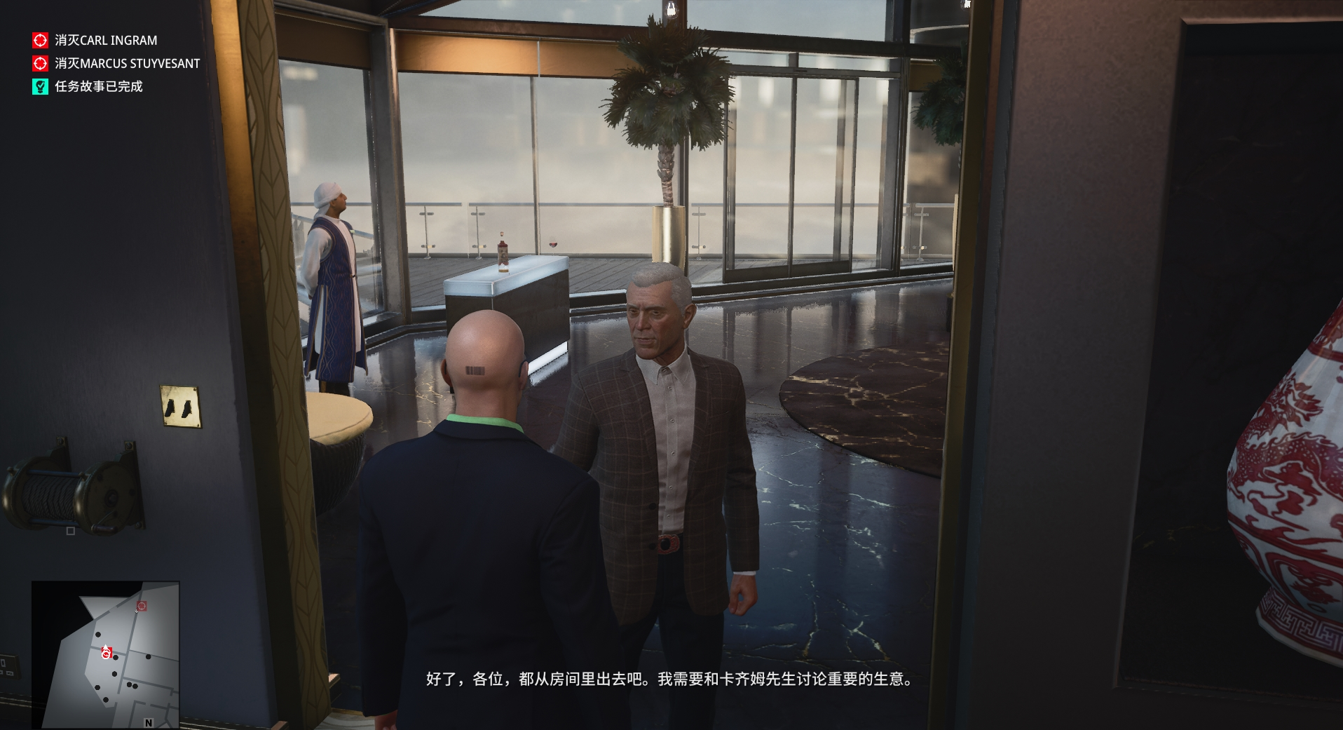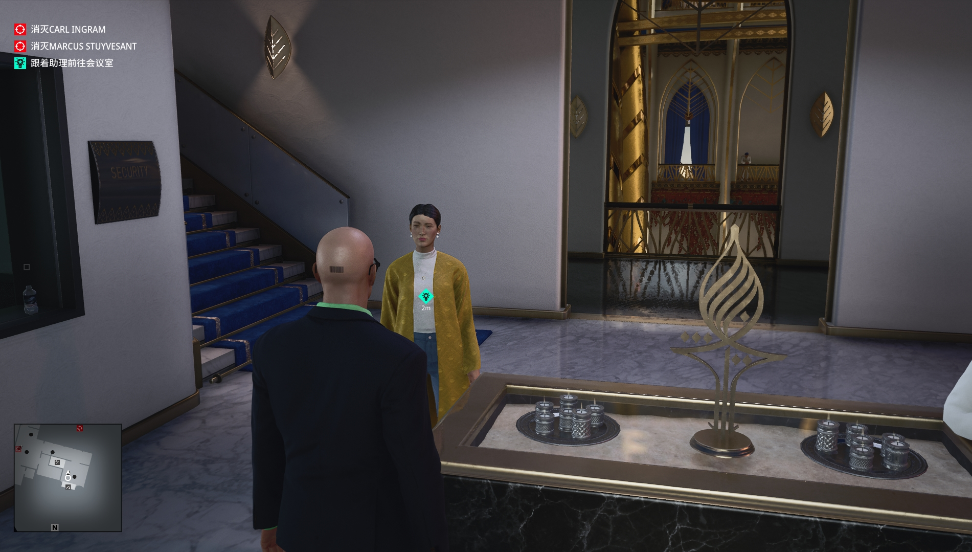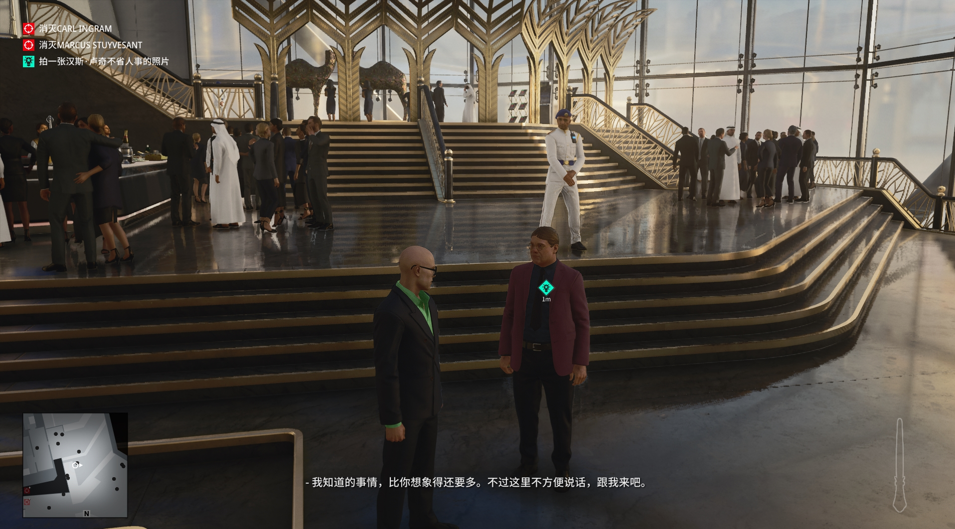 (4)根据任务提示来到大楼中心,会看见一个紫红色西装的胖子,就是我们的目标,与他交谈后,他会一直跟着我们,我们可以把他带到一个没有人的地方“解决他”我这里选择的是前面的厕所,关上门将他打晕,拿出相机拍摄他倒地的照片即可。