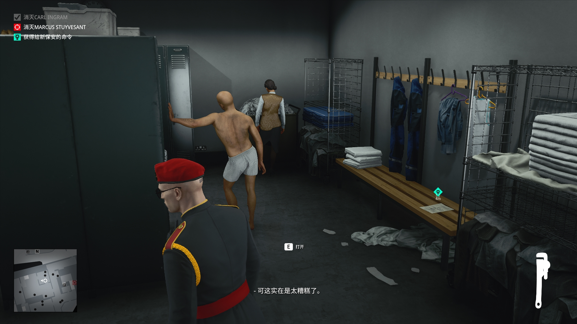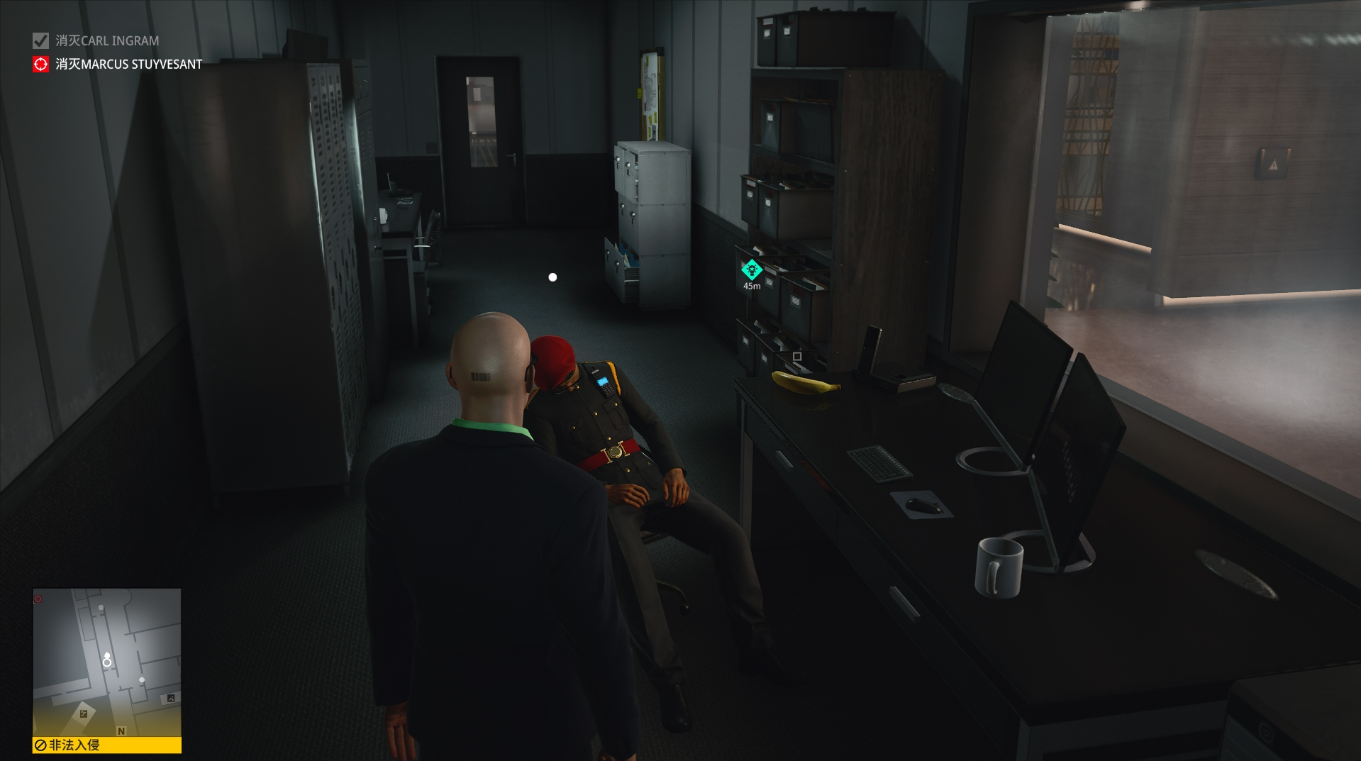 (1)我们可以来到楼下的保安室,将这个睡着的保安给打晕,并且换上他的服装(他的服装优先级高,不容易被发现),注意将他藏进旁边的柜子,避免被发现。