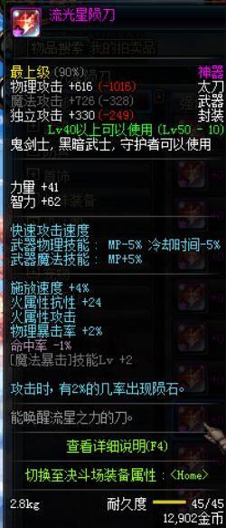 这把刀绝对是老玩家记忆深刻的一把刀,因为会掉陨石,又叫流星落。不知道有多少人第一次在街上看到时吃了一惊,居然有这么长这么帅的刀,在60版本前中期,普通装备最高也就50级,当然魔剑一类的除外,随便一个粉装价格都贵的离谱,更何况是玩家基数最多的鬼剑士的50级粉太刀,那时简直就是天价,可以当面rmb出售的武器,那个时候拿着这把刀就是土豪的象征,走到哪都能发现被一群路人点信息,楼主也是路人之一