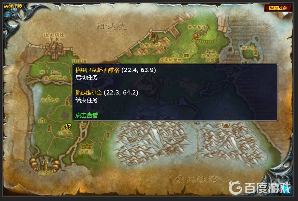 接取NPC格里尼克斯·西维格(灰熊丘陵,征服堡)和完成NPC赌徒维尔金(灰熊丘陵,征服堡)的位置坐标。