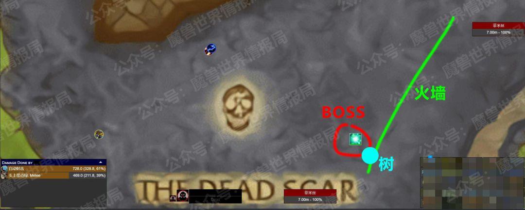 由此大致可以推断出,应该是将宠物定在地图右下方的火墙旁边的大树下,误导宠物开怪然后猎人。大约过去了十几秒钟,大团的其他成员才陆续进入战斗。应该是这种卡法并非100%成功,因此要等猎人卡成功之后其他团队成员才进入战斗,这样可以避免灭团。