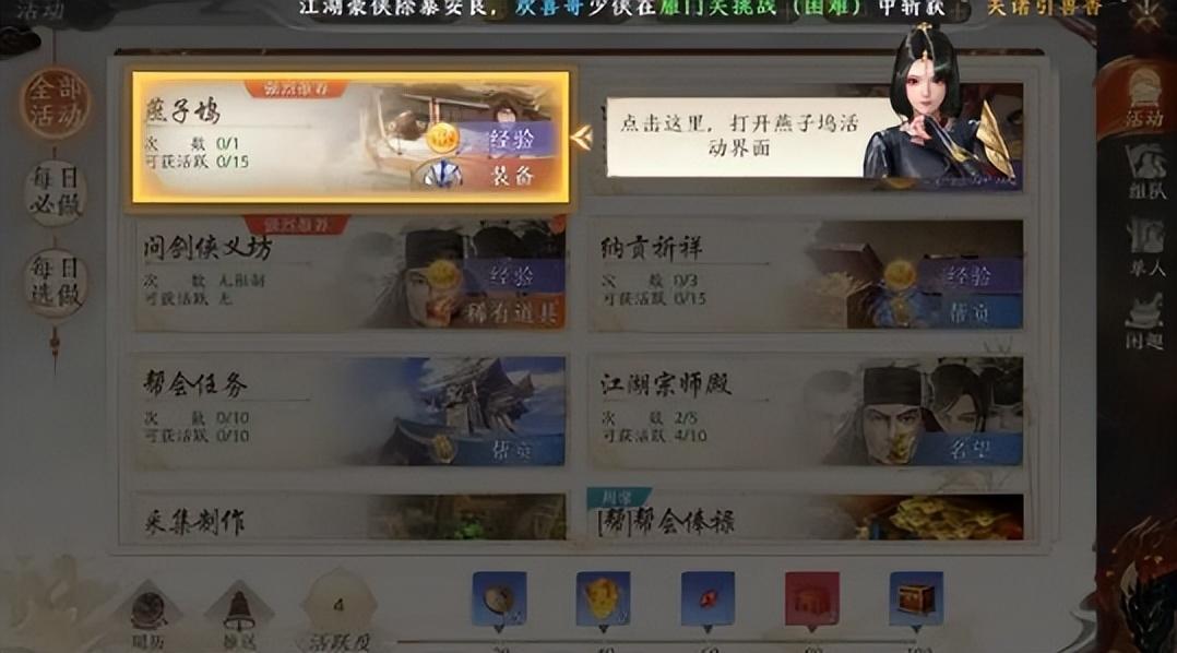 活(huo)动介绍:燕子坞活(huo)动每天第1次完成(cheng)会获得獎勵,可以自动战斗,协助他人进行燕子坞可以获得侠义值。