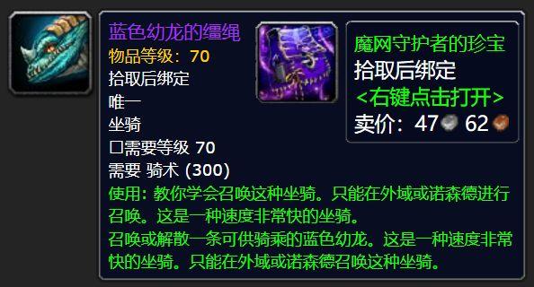 那么现在只是在WLK前夕,这位朋友是如何拿到蓝色幼龙坐骑的呢?这里我们需要讲到一个后面添加的物品,这也是导致此次BUG的关键。