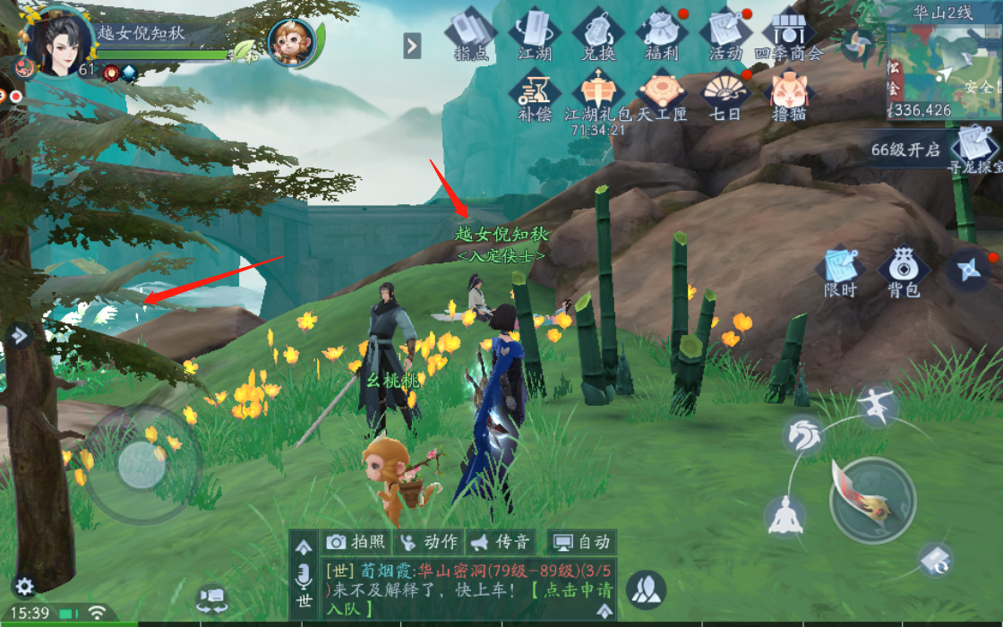 其实这个梗来源于华山中的奇遇任务,只要在华山地图(327,424)这个位置找到一颗松树就能够触发,如果真的找不到松树,那么我建议找一对撒狗粮的NPC,他们前面就是那颗松树了。可能对于单身狗的刺痛,比坐标数据更来得印象深刻吧。