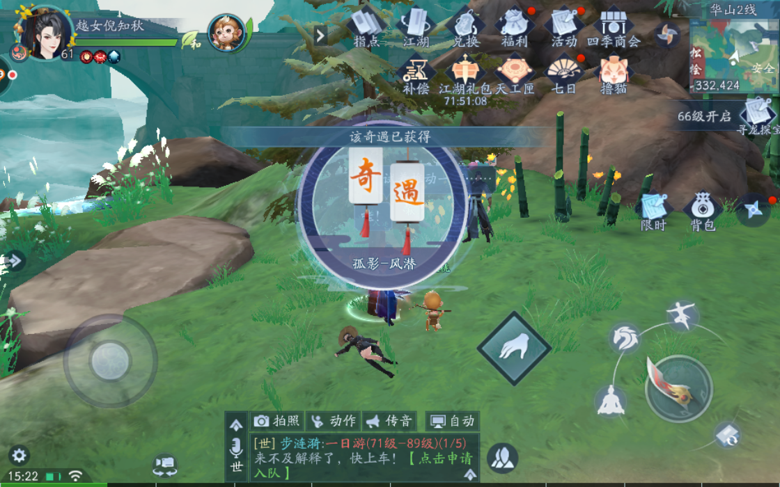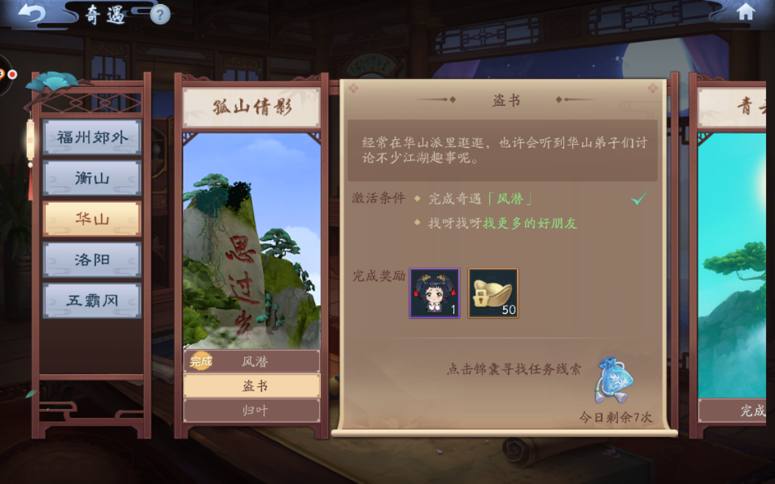 奇遇“风潜”是属于华山奇遇中孤山倩影的任务,那我自然是抱着好奇心继续触发奇遇,搞清楚神秘少女的面目,它的第二个奇遇触发条件是“找呀找朋友”,其实很简单,就是需要我不断在游戏中加好友,可对于数量没有一个要求,所以我只能不断的增加游戏中的好友数量。