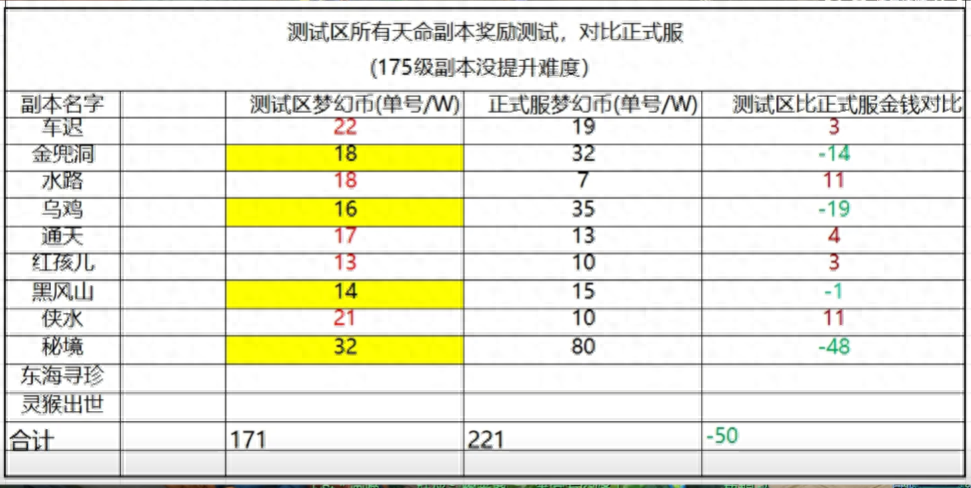 近日话题满满的“天命副本”备受热议,削奖励、只能匹配等流言层出不穷。于是,达人玩家就对开发测试服务器所有天命副本来了一轮测试。从手里来看,金兜洞、乌鸡国、秘境降妖等副本的金钱奖励确实少了,但侠水、水陆等副本的收益有所增加,综合下来少了50万左右。