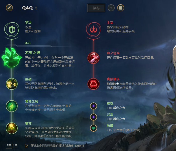 走上路的VN可以带坚决的不灭之握,增加续航能力,骸骨镀层来减伤,复苏之风和复苏。主宰的血之滋味和贪欲猎手,来补助增加的续航能力。毕竟脆皮走上路,生存和发育才是王道。只要前期不崩盘,中后期你用输出环境时,就是王。出门多兰盾加小血瓶,盾加复苏和复苏之封,谁用谁知道它们的契合度。