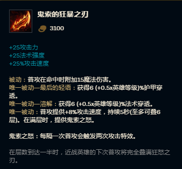核心装备破败没有之一!“羊刀”(鬼索的狂暴之刃)改版了,可以先十字镐加攻击,出装更没有压力,攻击有,攻速也有了。再来出破败,加上攻速鞋子,你就可以横着走了,遇到单人,只要不是被先手控制,只要你操作不是太烂,基本人头向你招手。绿叉,无尽,最后复活或者水银刀等装备,看你自己喜好和对面阵容。
