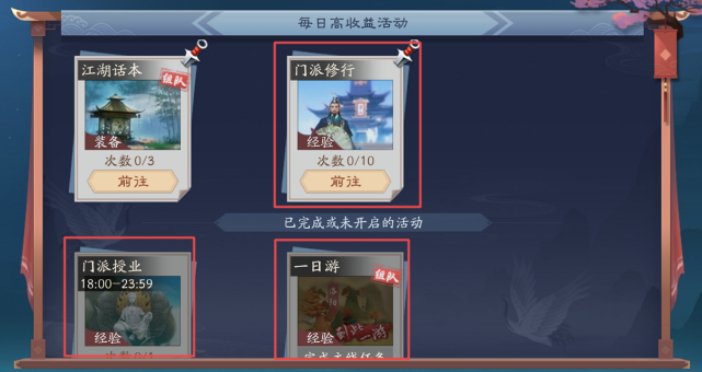 首先是升级,跑主线做任务都可以升级,除此之外,还可以依靠每日活动升级。像每日必做中的【门派修行】、【门派授业】和【一日游】,都会奖励大量的角色经验,不过需要注意的是【门派授业】是有固定开放时间的,只有18点到24点前这段时间才会向玩家开放。另外,每日挑战中的【侠客挑战】也是一个非常不错的单人经验副本。如果各位想要快速的提升等级,那么这些玩法绝对都是必不可缺的。