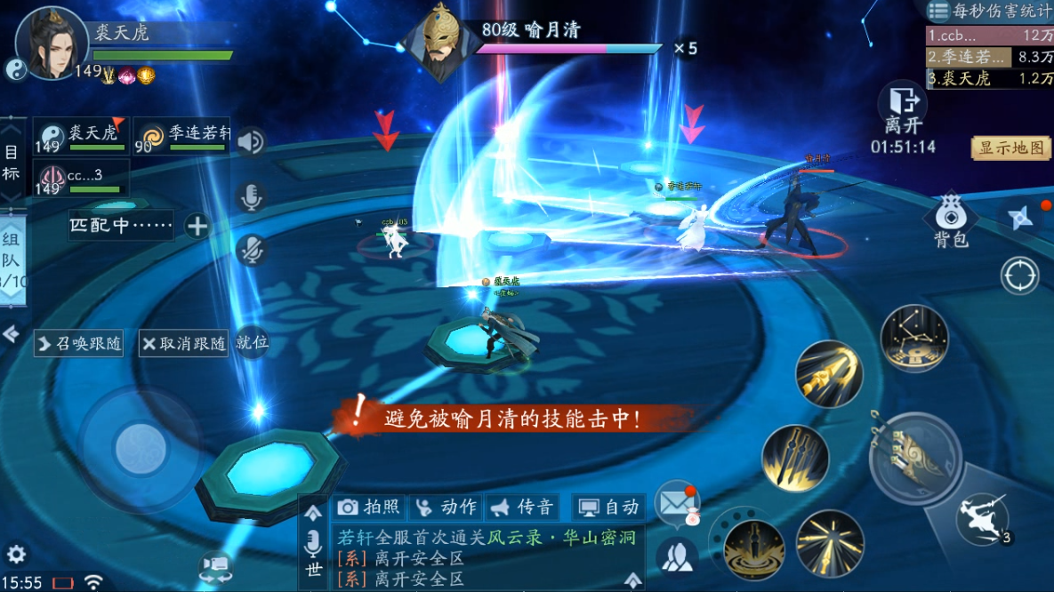 下面来说一说喻月清的技能,首先是星光刀斩,2次扇形攻击,至多可点亮两颗星,但是在二阶段会变成4次,也就是说如果4次有4位玩家被击中,那么可一次性点亮4颗星,那将是致命的。所以这个技能伤害虽然不高,但还是推荐各位养成走位躲避的好习惯。