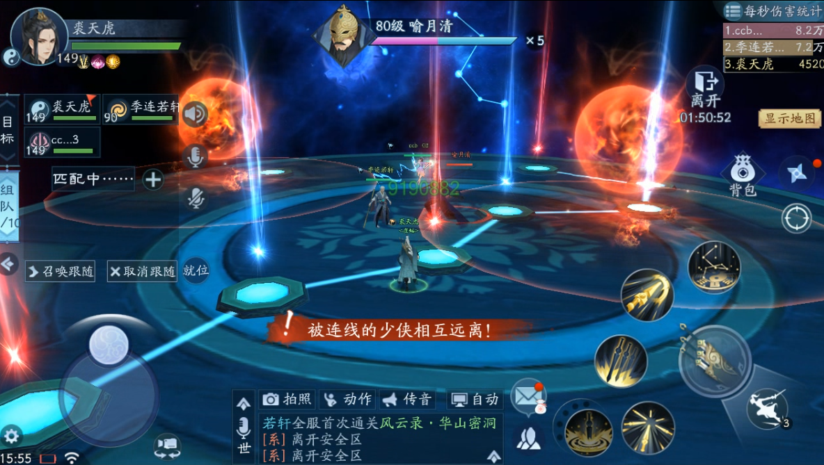 星落会对随机3名玩家落下陨石,造成圆形AOE伤害,并点亮1颗星;星象连接会随机连线两位玩家,被连线的玩家需要相互远离拉断连线,否则会受到持续伤害。这两个技能躲避的难度都不大,哪怕没有轻功,也可以通过走位躲闪。