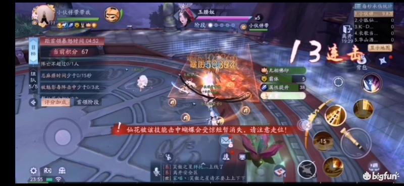 刚到2条血和1条血的时候全屏扇形放完后需要给仙花分摊,T和拉boss技能方向的两人各就各位,让另外3个人去分摊。