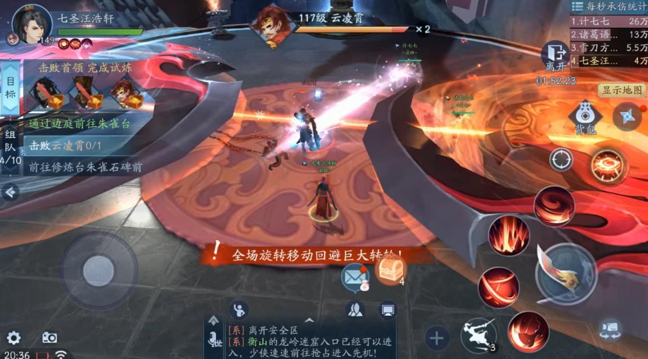 日月回旋:云凌霄扔出日月冰火转轮,转轮开始沿整个场地顺时针旋转,玩家注意顺时针躲避。