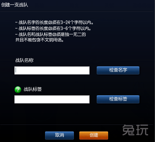 3.点击之后我们可以看到,可以输入我们的战队名字和战队标签。