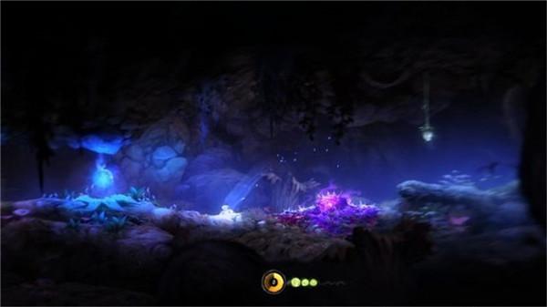 击破弹床右侧的一排尖刺球,奥日会发现到一个能量井(或叫作精灵之井),能量井可以为奥日恢复满所有的能量,使用之后学会的飞檐走壁(后期才能学会)爬上右侧的岩壁可以获得能量核心(2/15)。